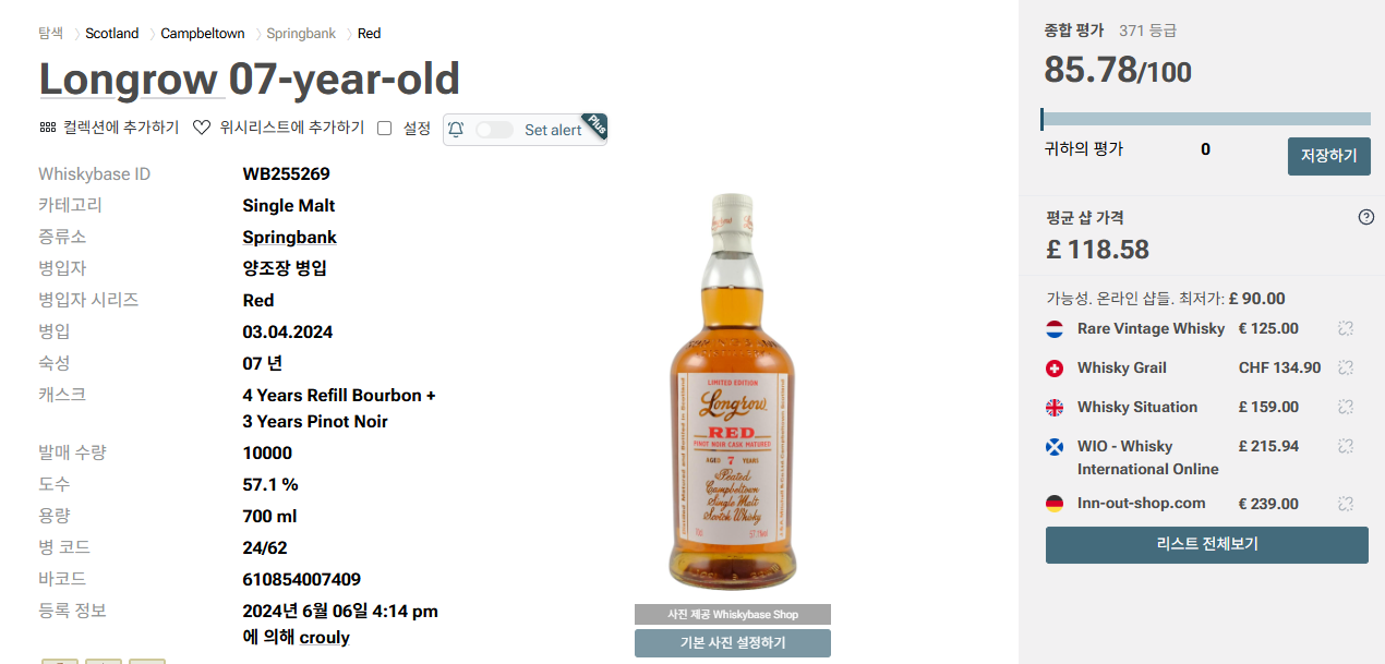 - 숙성 캐스크: 4년 리필 버번 → 3년 피노 누아 레드 와인 캐스크