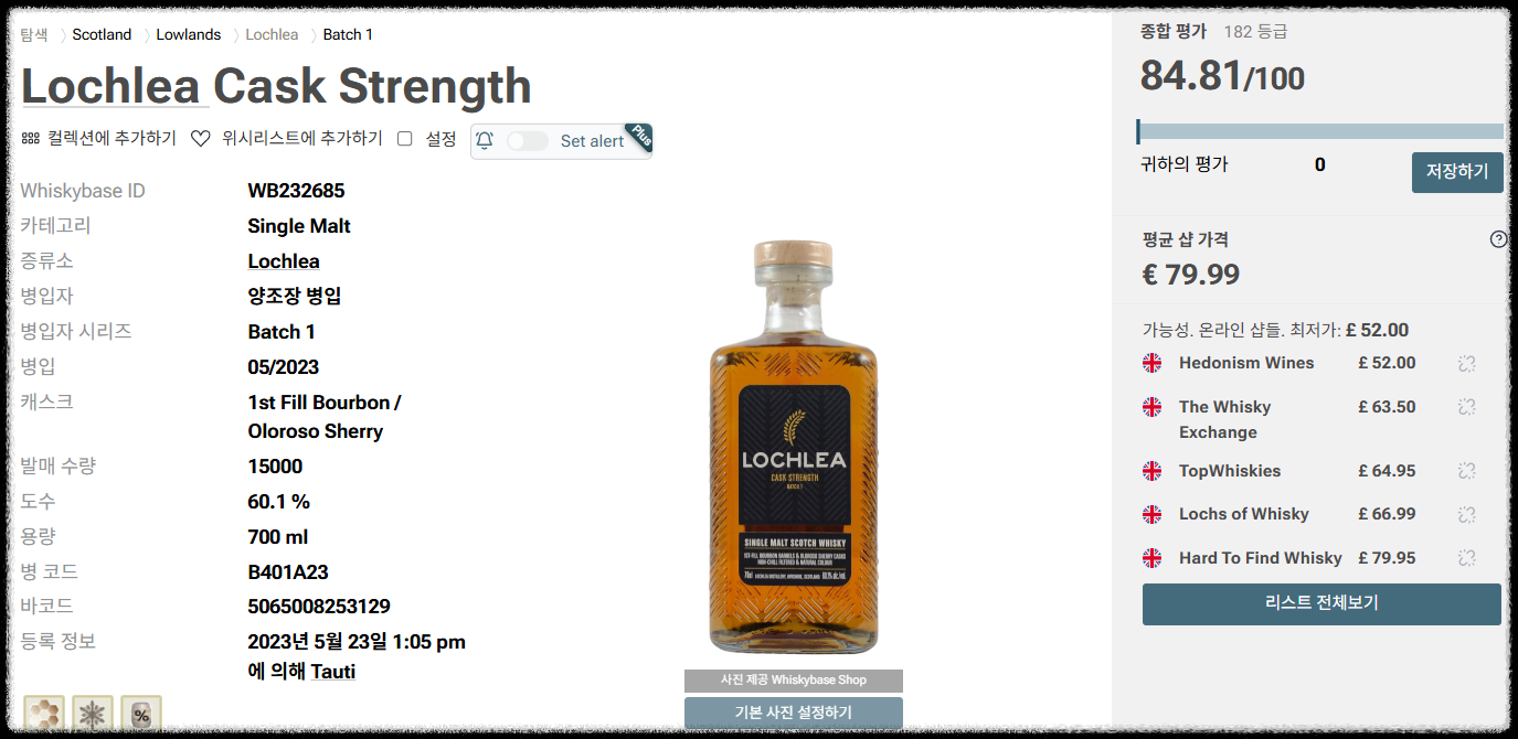 - Whiskybase 점수: 84.81점(링크)