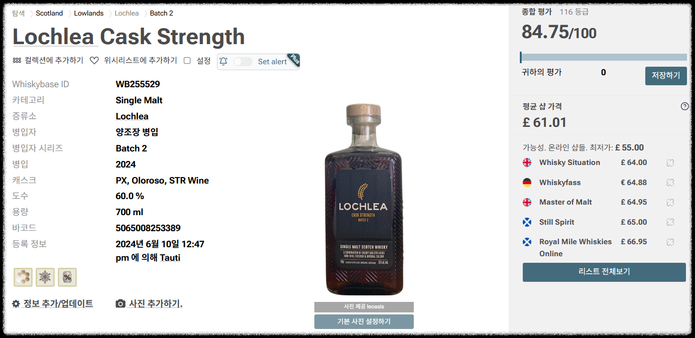 - Whiskybase 점수: 84.69점(링크)