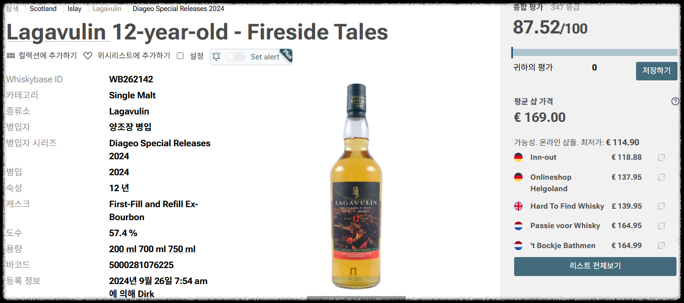 - Whiskybase: 87.52 — https://www.whiskybase.com/whiskies/whisky/262142/lagavulin-12-year-old-fireside-tales